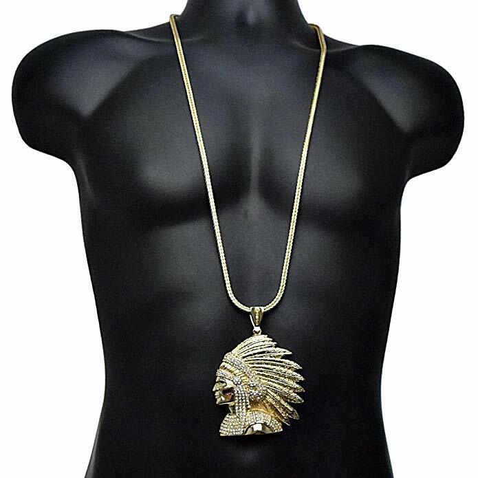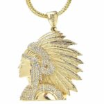 Make a bold statement with this iced out Apache Indian Chief pendant necklace, designed for those who appreciate standout hip hop jewelry with commanding presence. This oversized gold pendant features a detailed Native-inspired chief design, fully micro-paved with brilliant simulated CZ stones that deliver maximum shine from every angle.