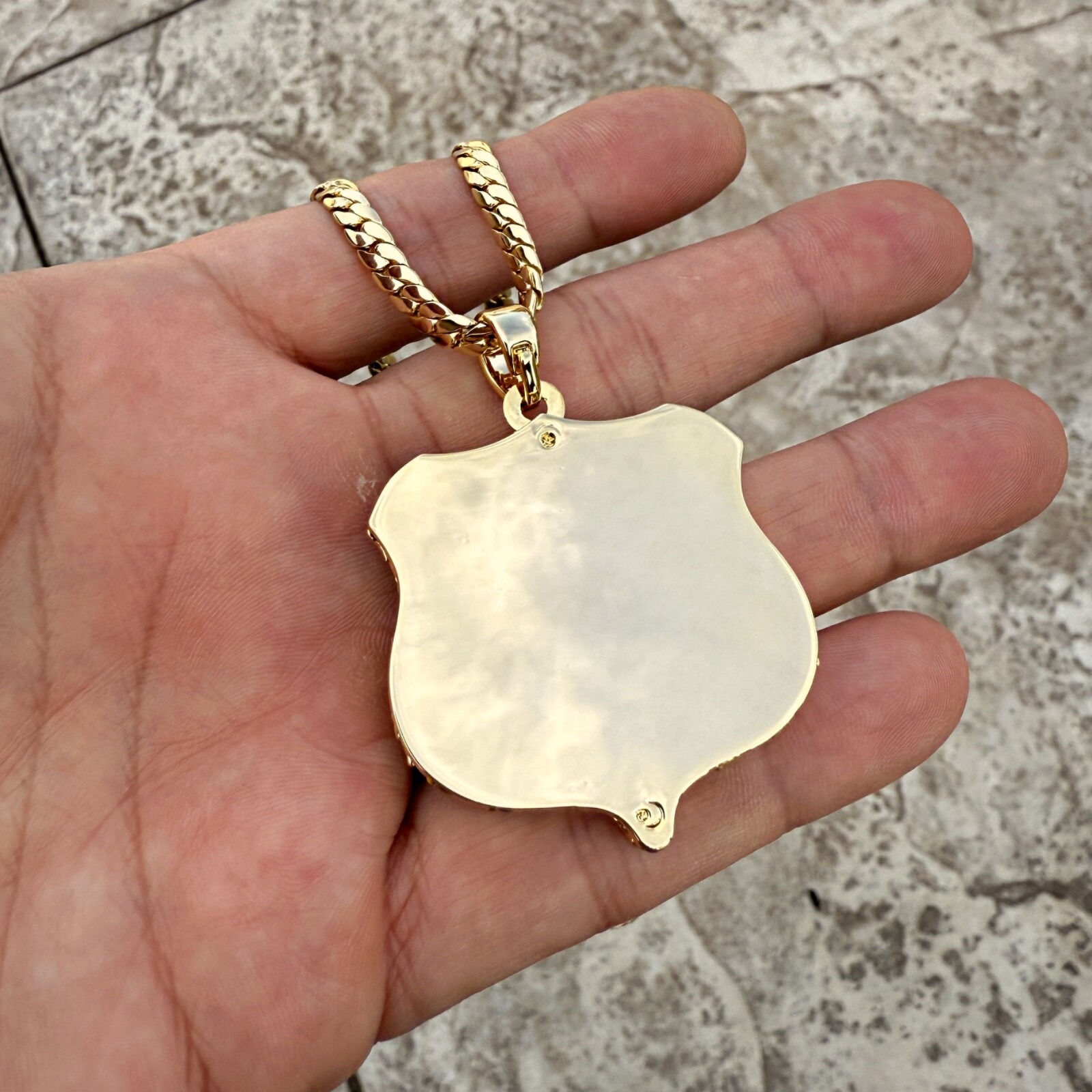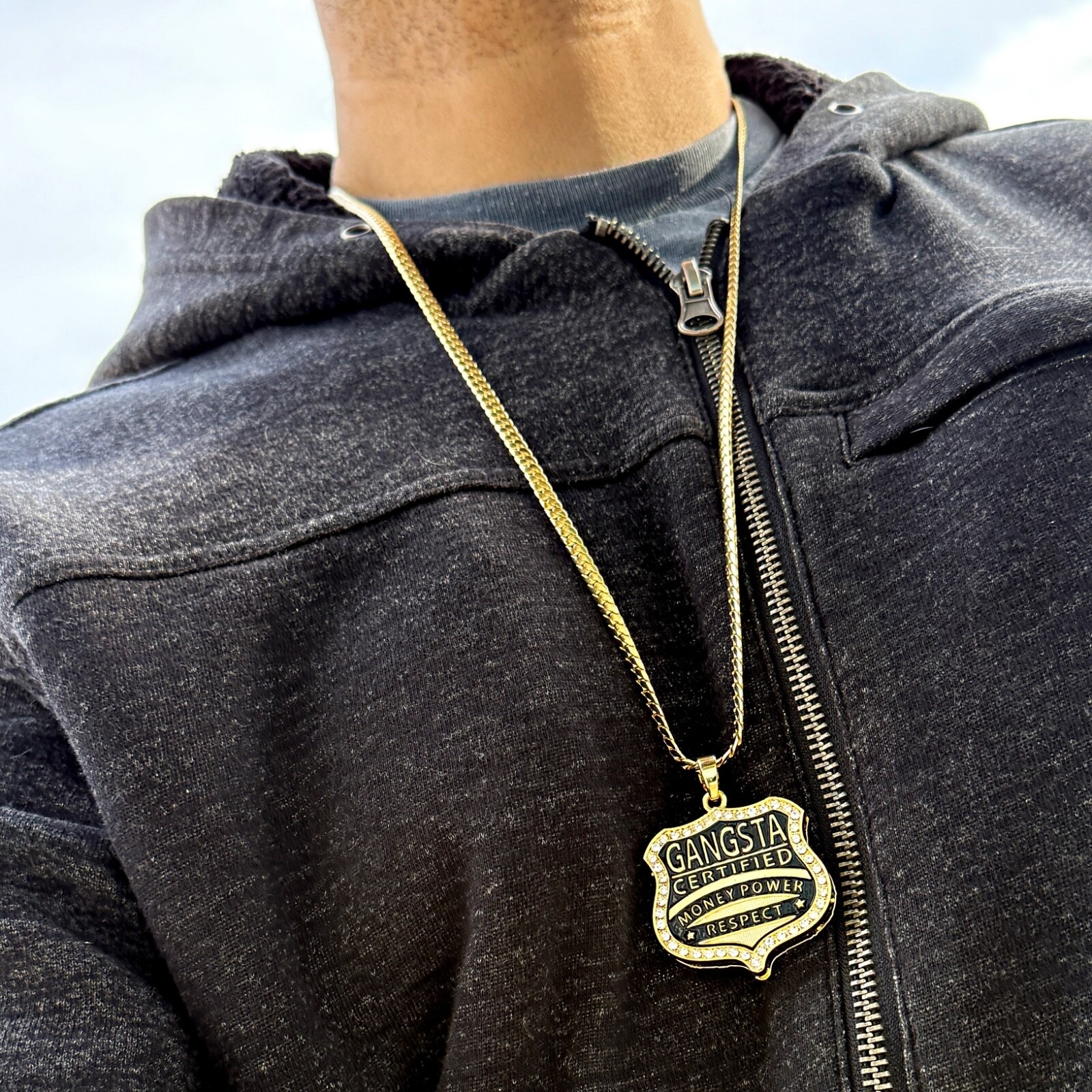 Make a bold statement with this 14K gold plated Miami Cuban chain necklace and pendant set, designed for standout street style and confident everyday wear. This eye-catching cuban necklace features a classic 5mm chain link necklace design paired with a sparkling “Money Power Respect” badge pendant that demands attention.