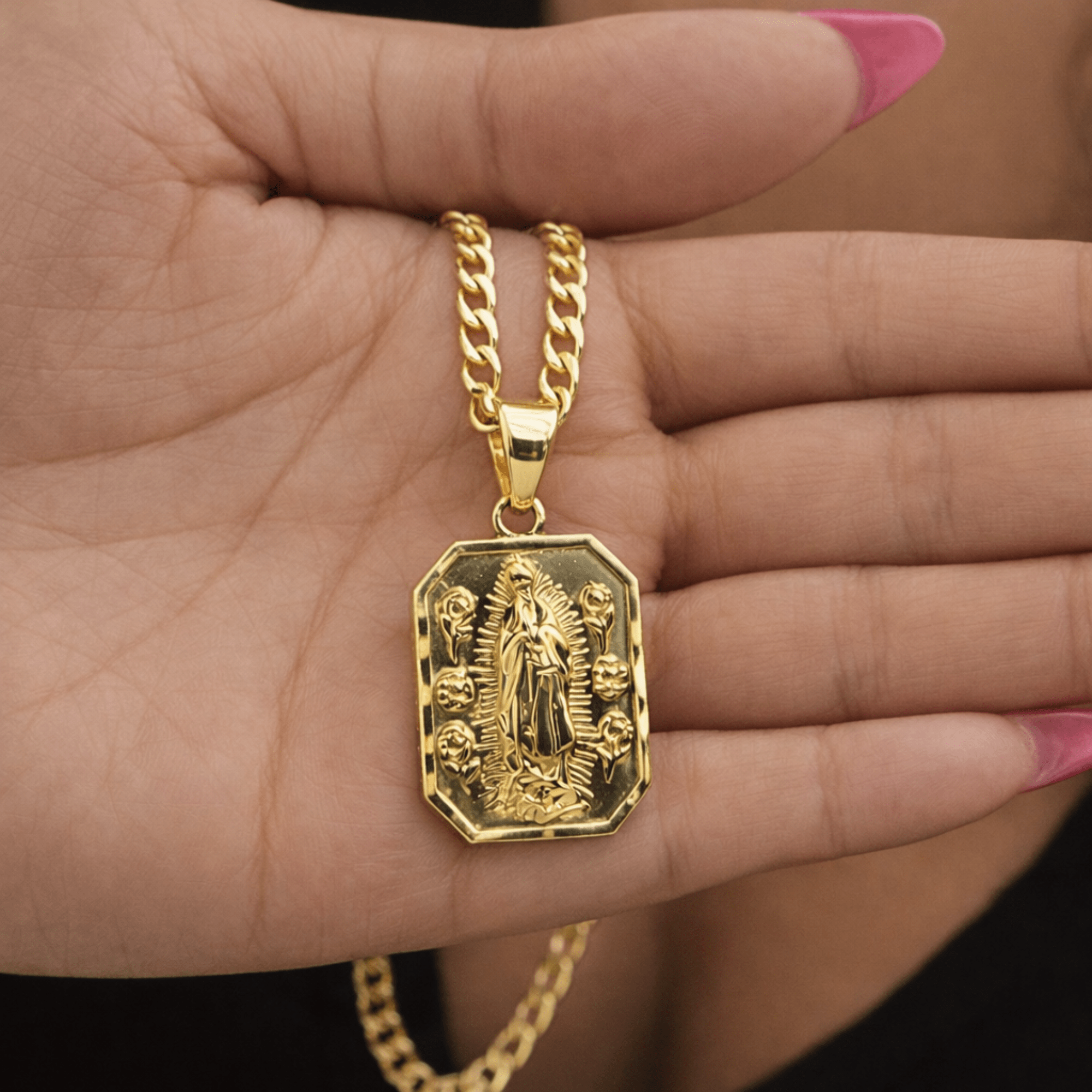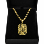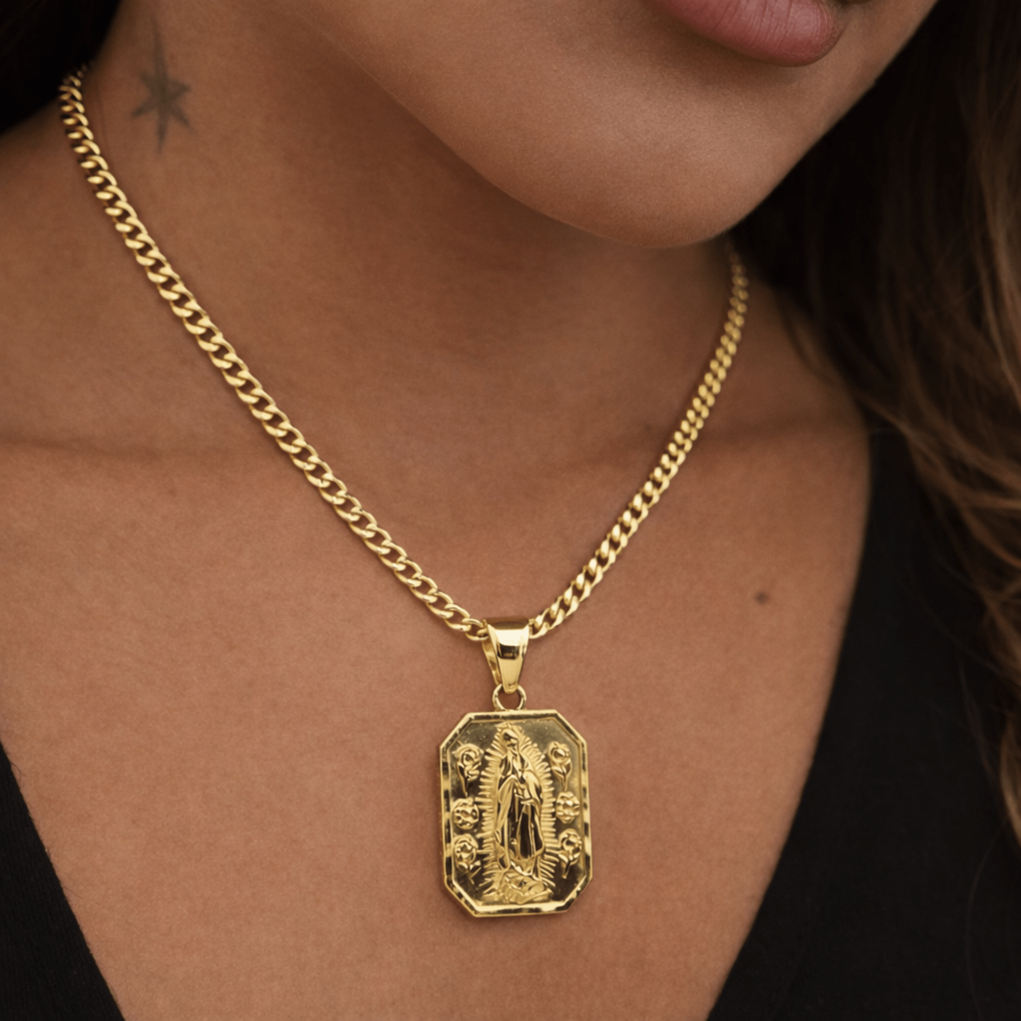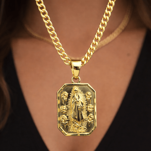 This stylish Virgin Mary Pendant paired with a bold cuban chain necklace delivers both faith and fashion in one powerful look. The polished miami cuban link design adds shine and presence whether worn alone or layered.