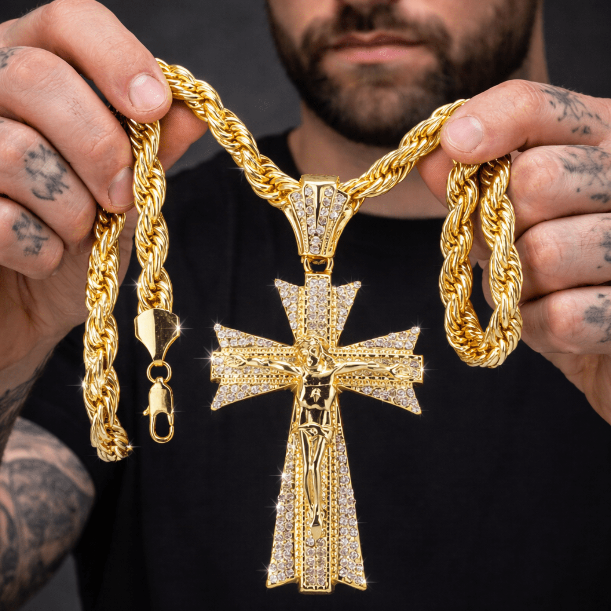 Make a bold statement with this 14K gold-tone rope chain necklace featuring a large Latin Jesus cross pendant. Designed for standout streetwear style, this gold rope necklace has a thick 10mm profile and comes in your choice of 20” or 24” length for the perfect fit. Whether worn alone or layered, this mens necklace delivers a strong, confident look with a polished finish and secure lobster clasp.