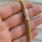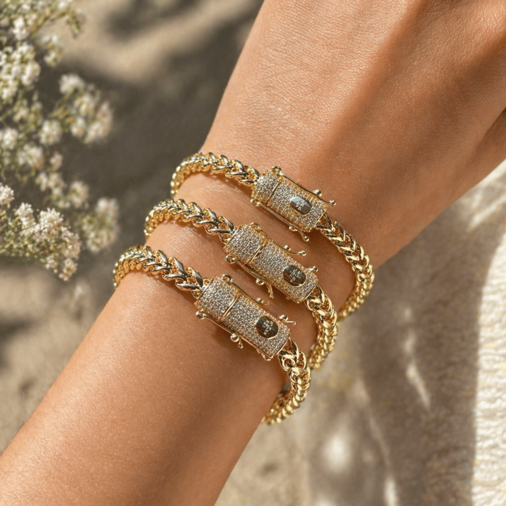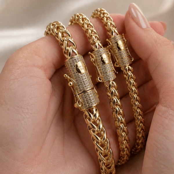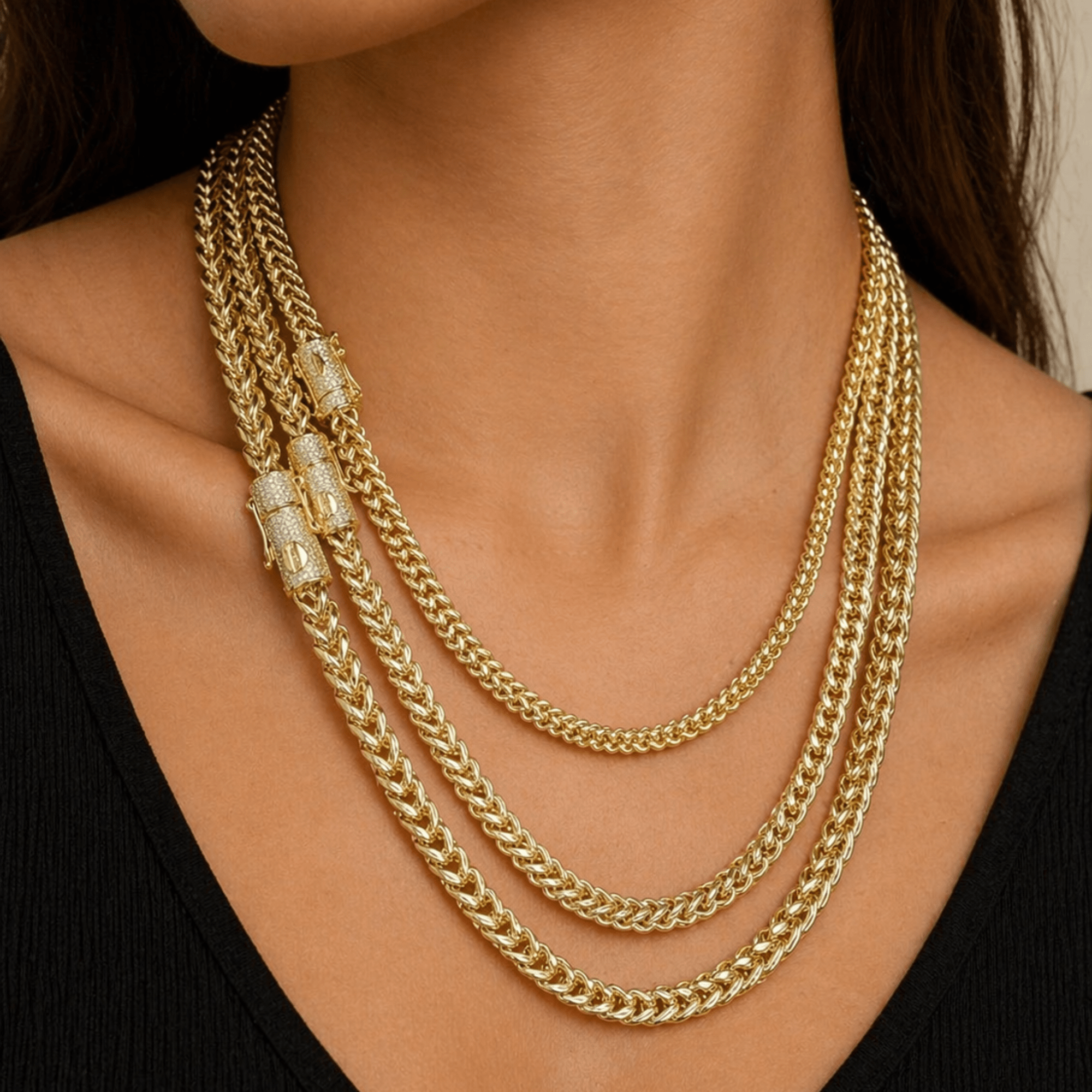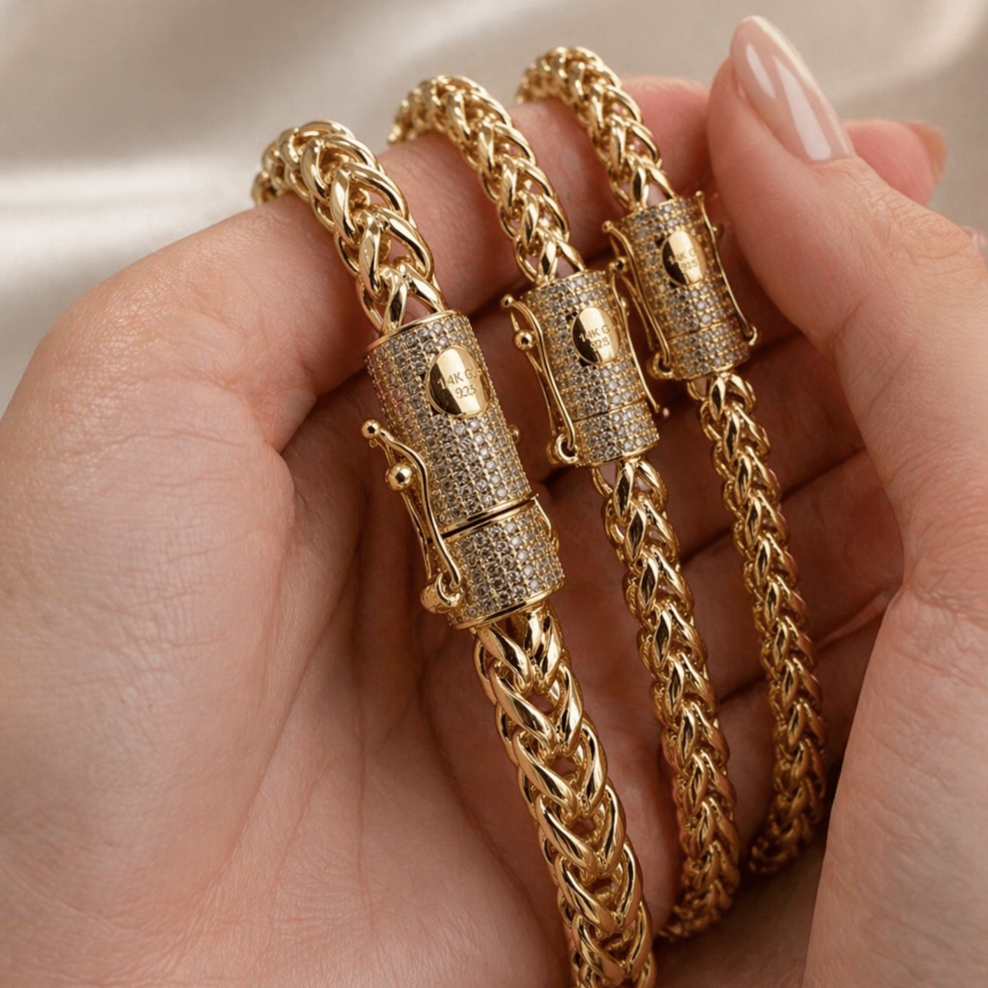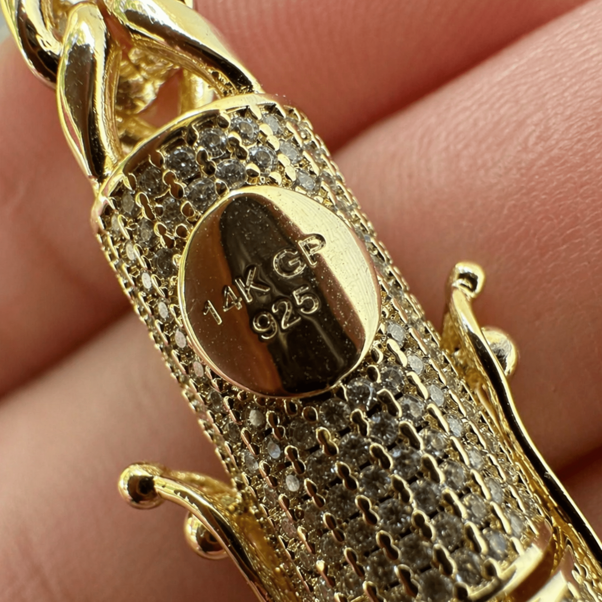 This Franco Chain is crafted with a strong stainless steel base and finished in rich 14K yellow gold plating. The clasp is stamped “14K GP” and detailed with brilliant moissanite stones for a high-end sparkle. Wear it as a bold Franco Necklace, choose the matching chain bracelet, or style both together for a complete iced look.