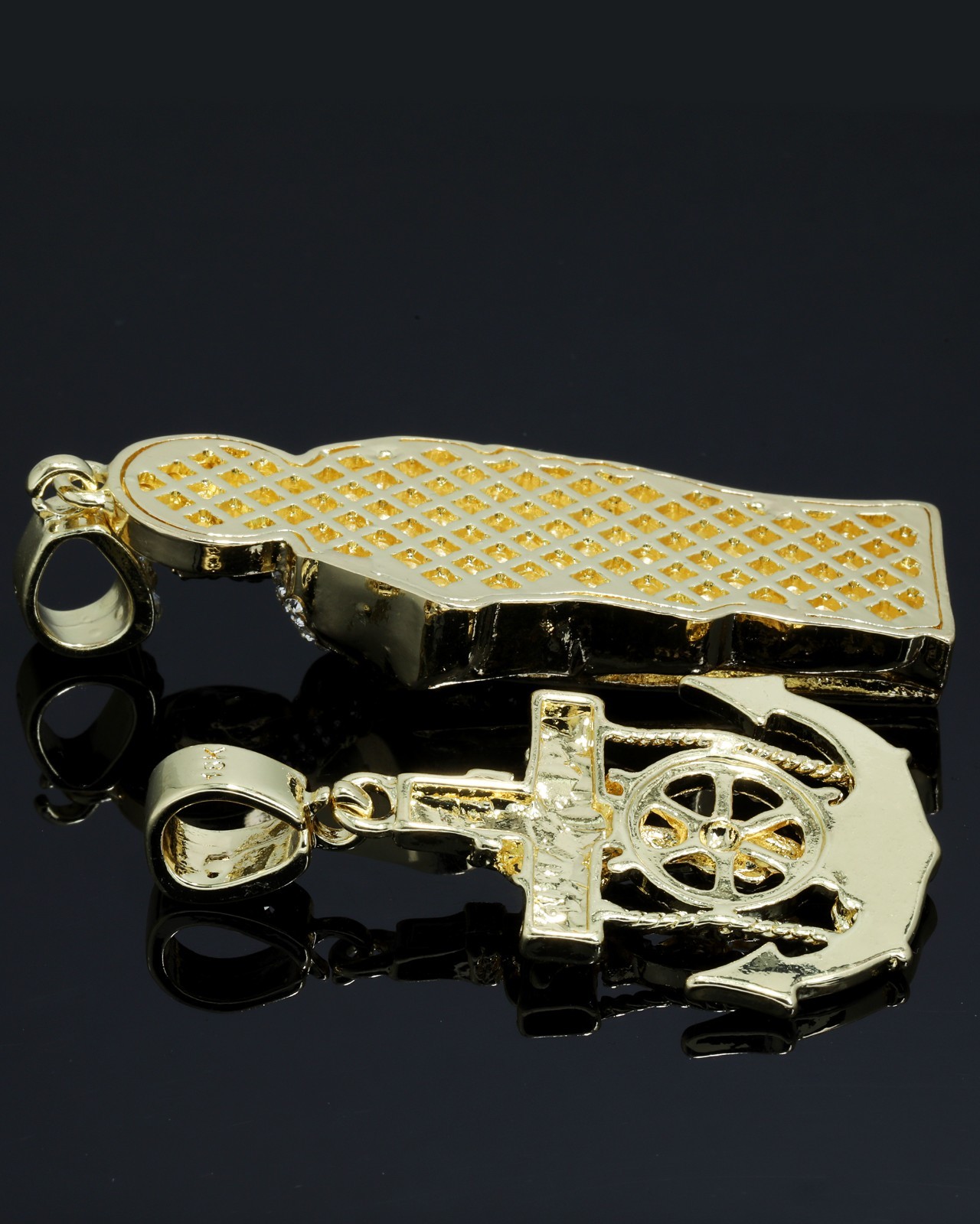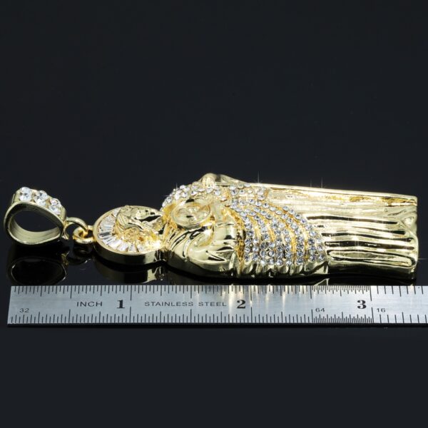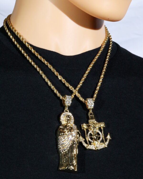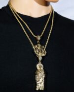 Make a bold statement with this San Judas Tadeo Pendant & Necklace, iced sparkling cubic zirconia and finished in rich 14k gold plating. A powerful piece of hip-hop jewelry designed to shine bright at every angle.”