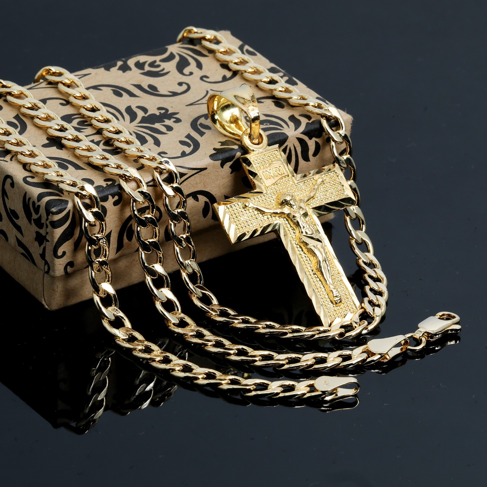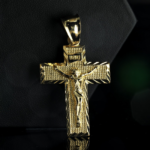 The detailed INRI Jesus cross pendant symbolizes devotion while maintaining a contemporary hip-hop edge. Accented with CZ jewelry stones, this gold pendant reflects light beautifully, making it suitable for casual wear or special events.