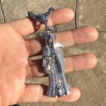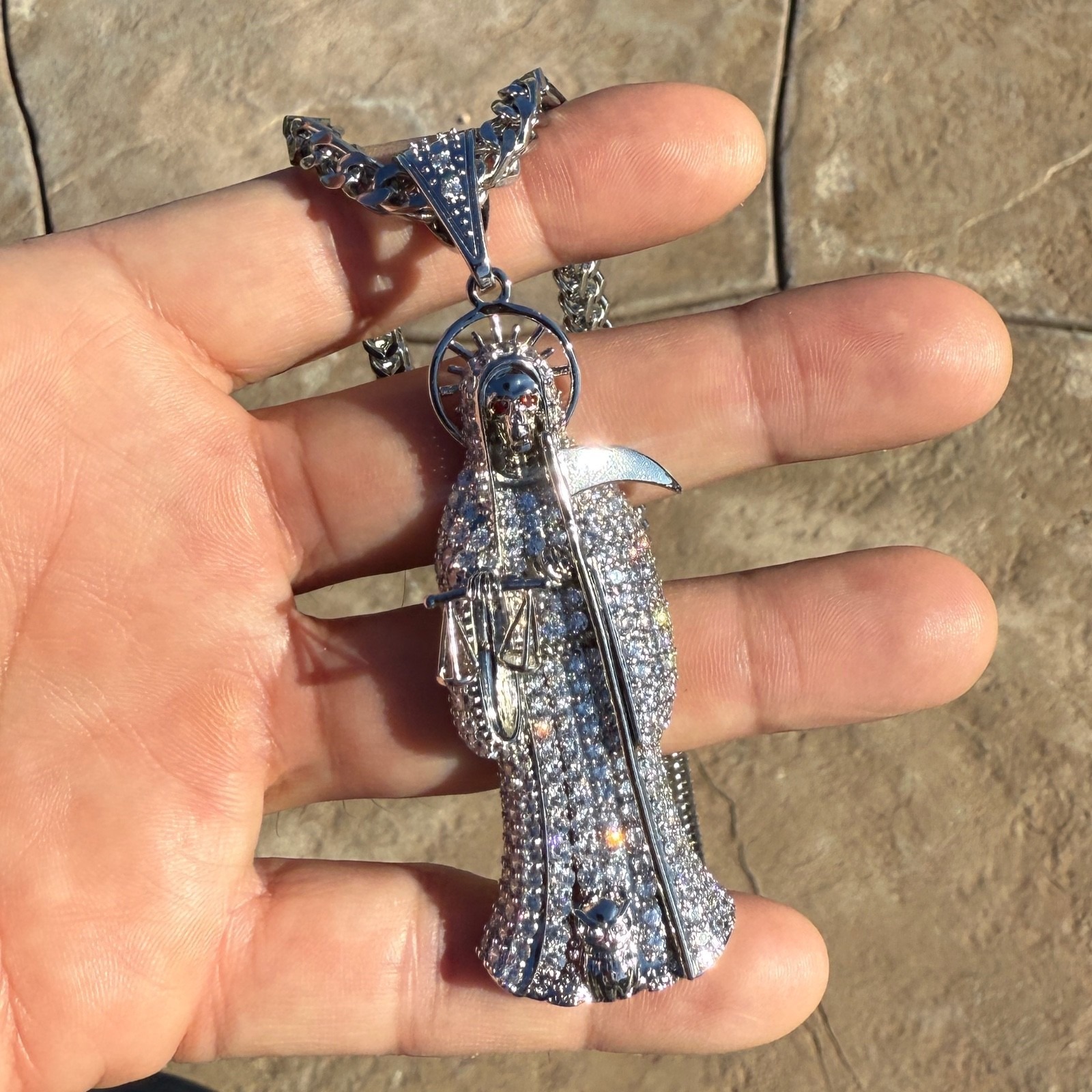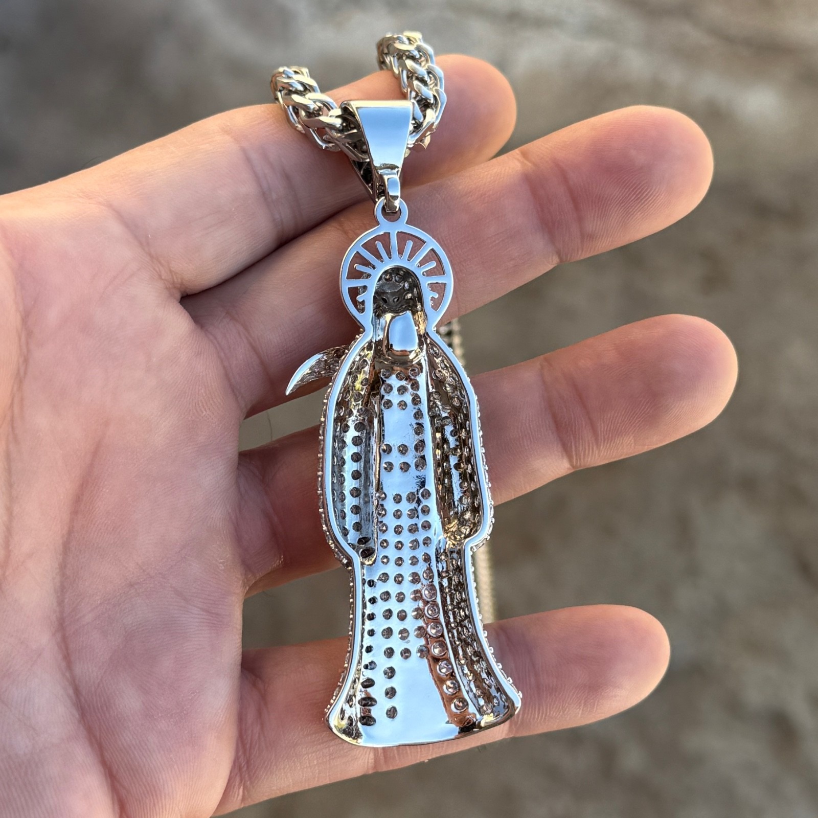 The pendant delivers the look of a diamond pendant and iced out pendant, making it a standout piece for collectors of bold religious and streetwear jewelry.