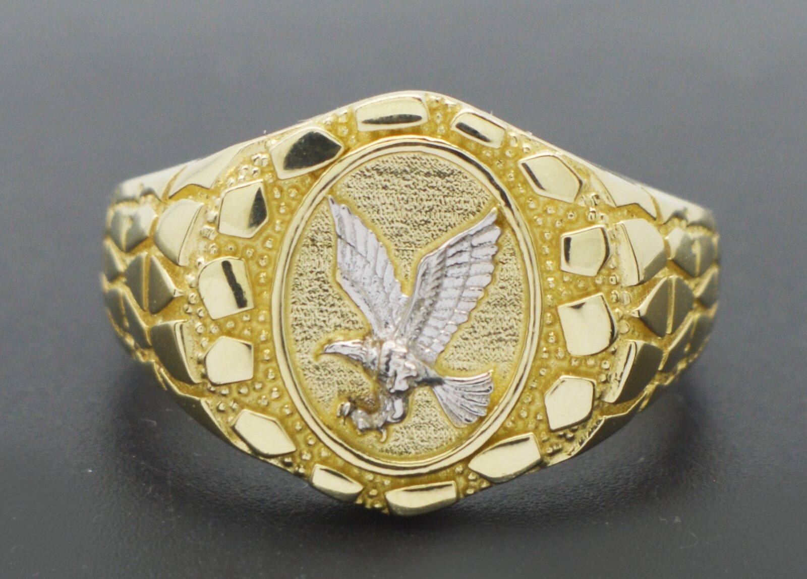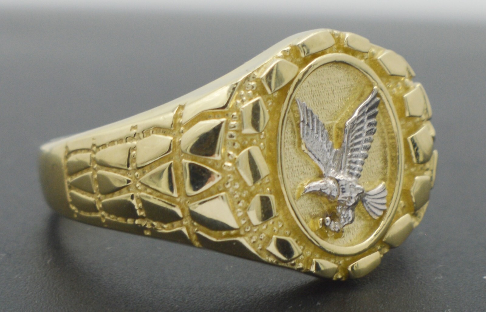 Make a bold statement with this powerful mens 10k gold ring featuring a detailed eagle nugget design. Crafted from authentic 10k solid gold, this ring blends strength, symbolism, and classic style into one standout piece of gold jewelry.