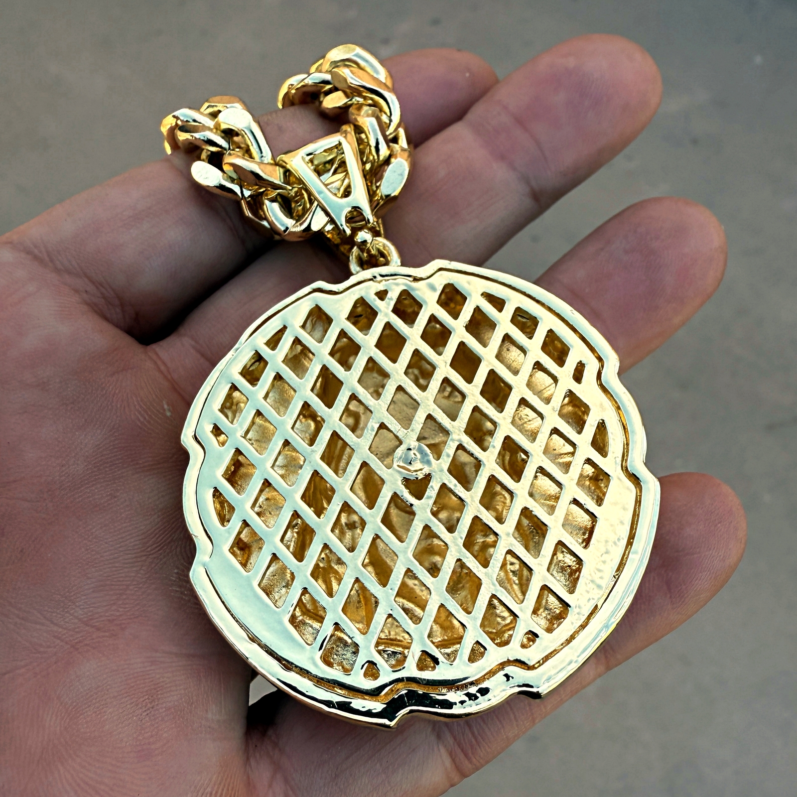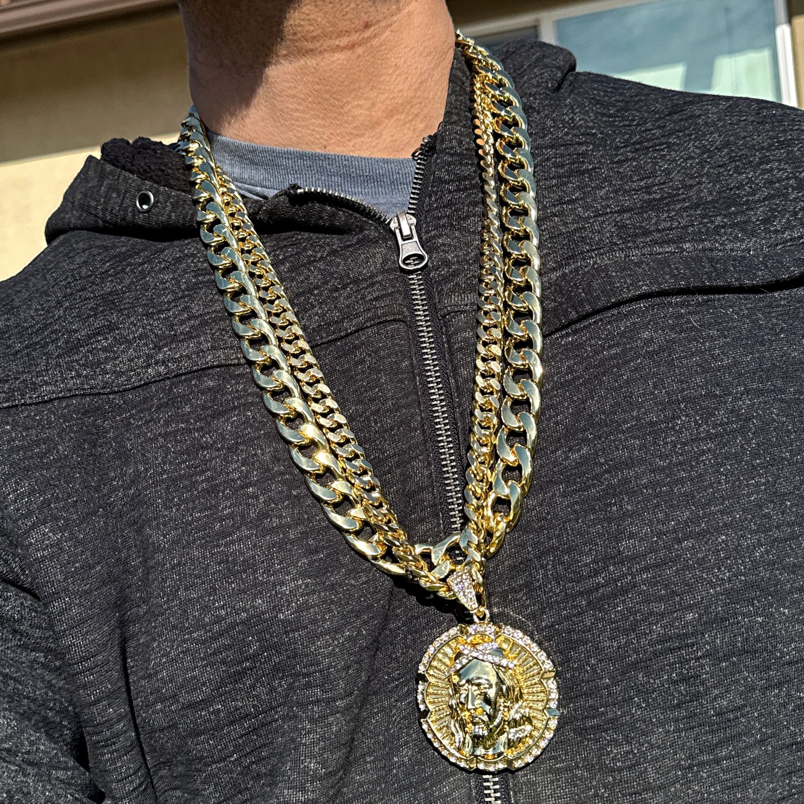 Make a bold statement with this men’s 14K gold plated Jesus face gemstone pendant necklace set, designed for maximum shine and heavyweight presence. This premium Miami Cuban link necklace set includes two solid 30-inch Cuban chains paired with a fully iced out CZ gold pendant, delivering authentic hip hop luxury at an unbeatable value.