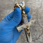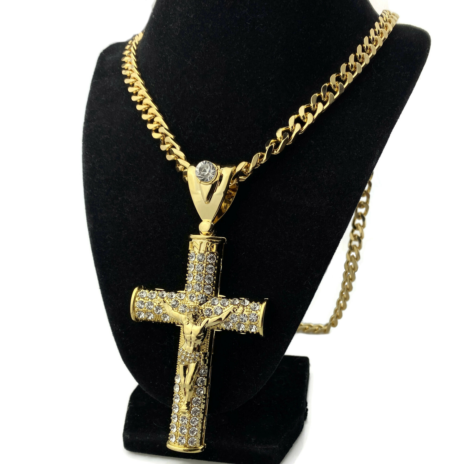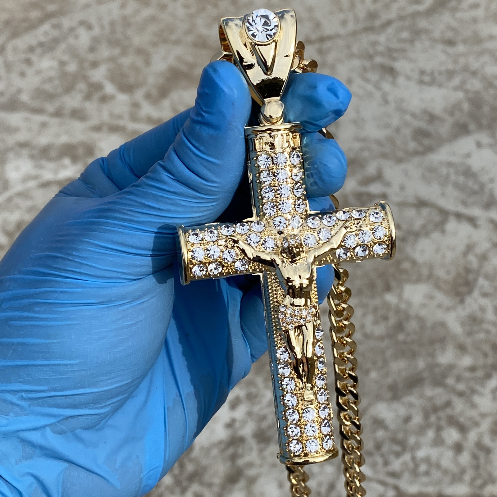 Make a bold statement with this men’s 18K gold plated Jesus cross pendant necklace, designed for standout style and durability. This eye-catching yellow gold pendant features a massive crucifix iced with dazzling round-cut stones, delivering serious shine with unmistakable presence.