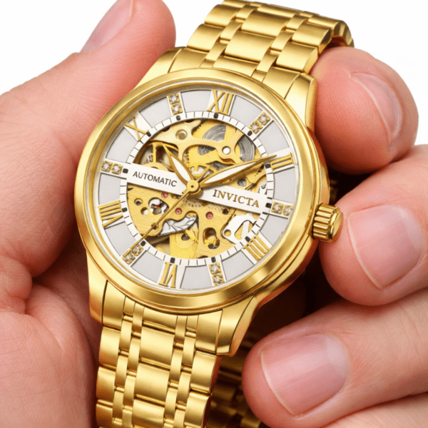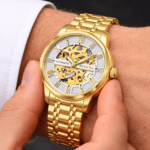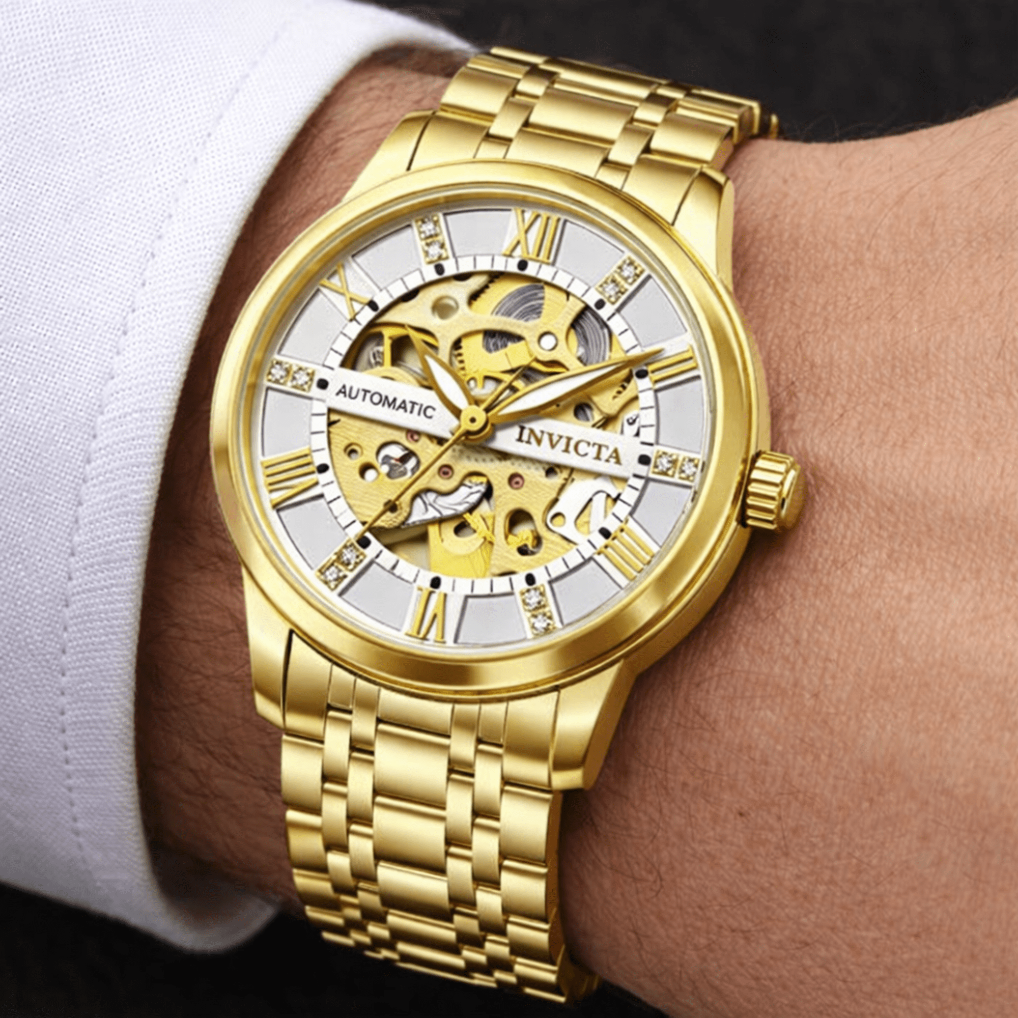 Crafted with a gold-tone stainless steel band and case, this elegant mens luxury watch brings a polished finish that works for both everyday wear and special occasions. The silver-tone dial, automatic movement, and classic skeleton design make this luxury watch a timeless addition to any collection. Whether you are shopping for yourself or looking for a stylish gift, this watch for men offers a premium look with standout detail.