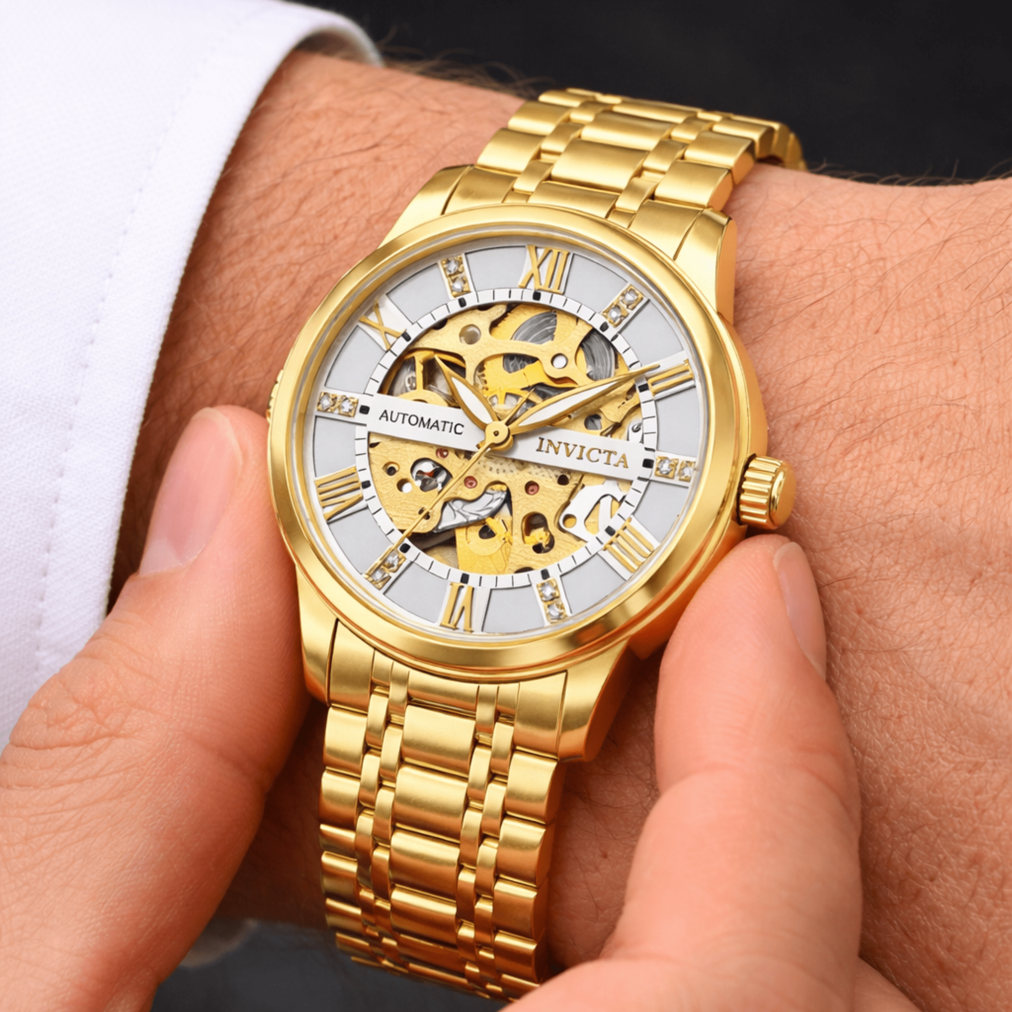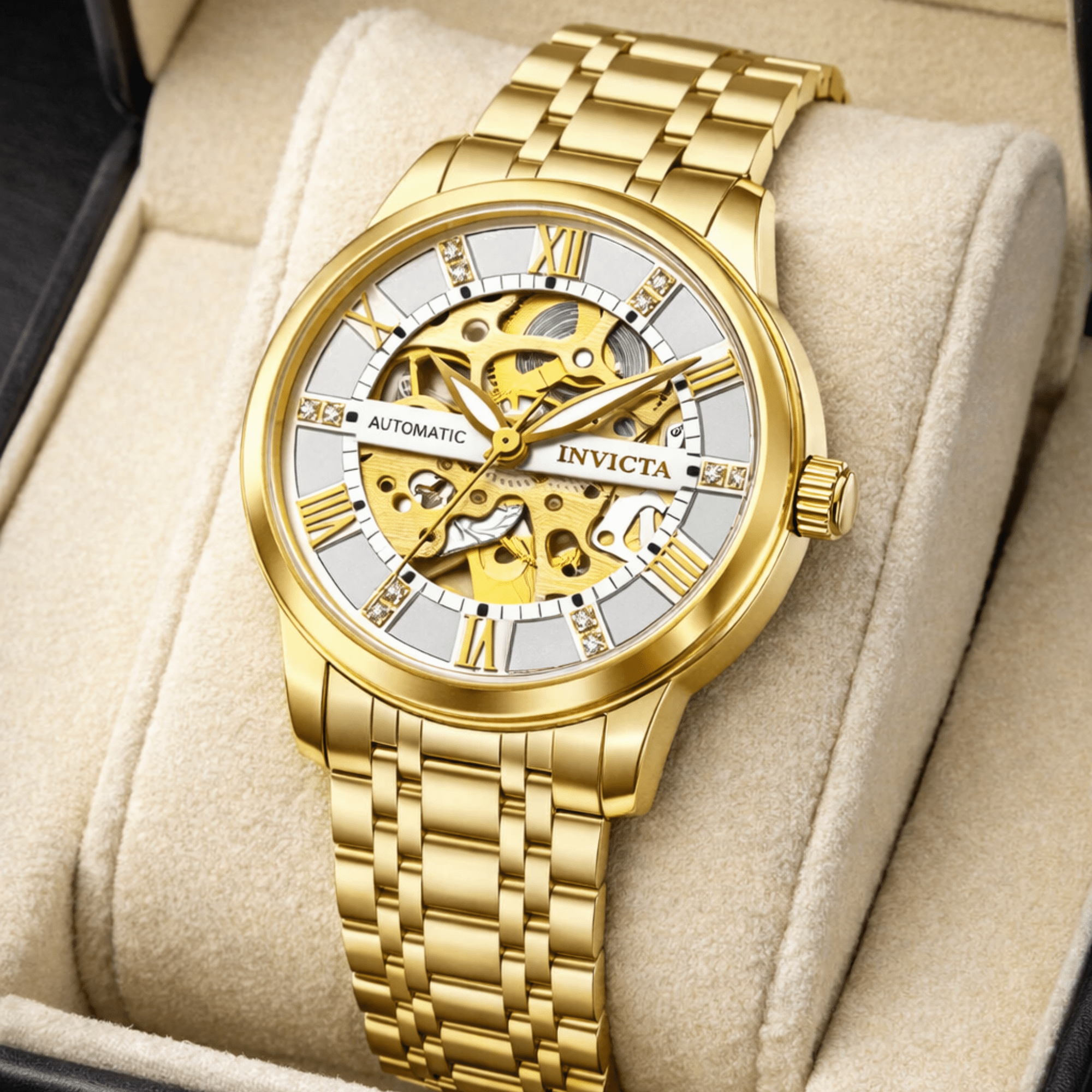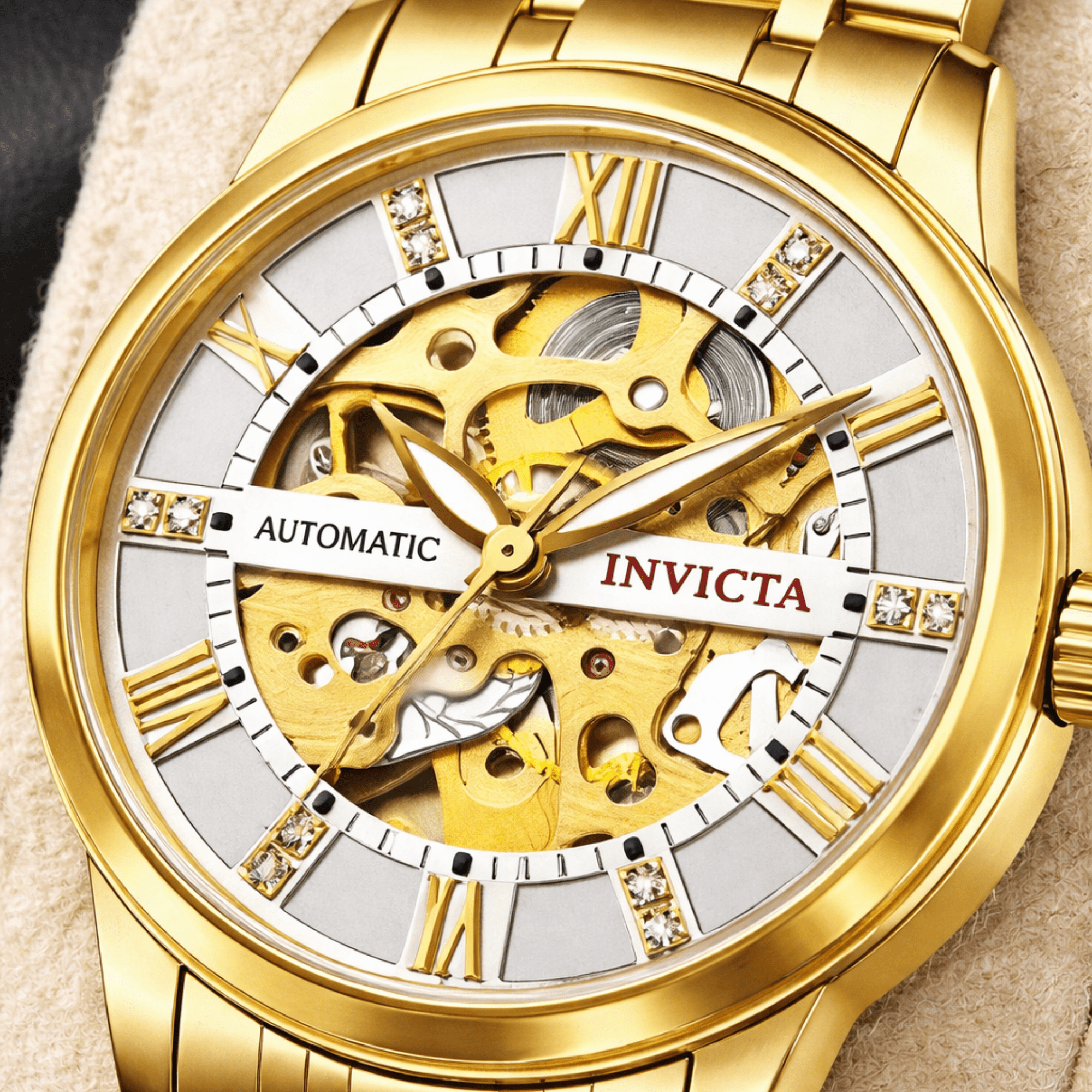 Upgrade your style with this bold mens watch from Invicta’s Objet D’Art collection. Designed to stand out, this stunning mechanical mens watch features a detailed skeleton dial that lets you see the inner movement at work, giving it a refined and eye-catching look. If you want a statement men watch that blends fashion and function, this piece delivers.