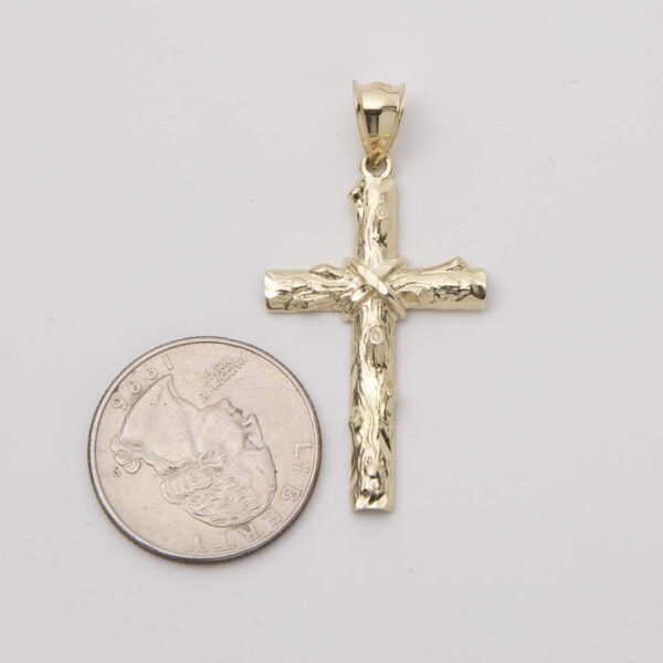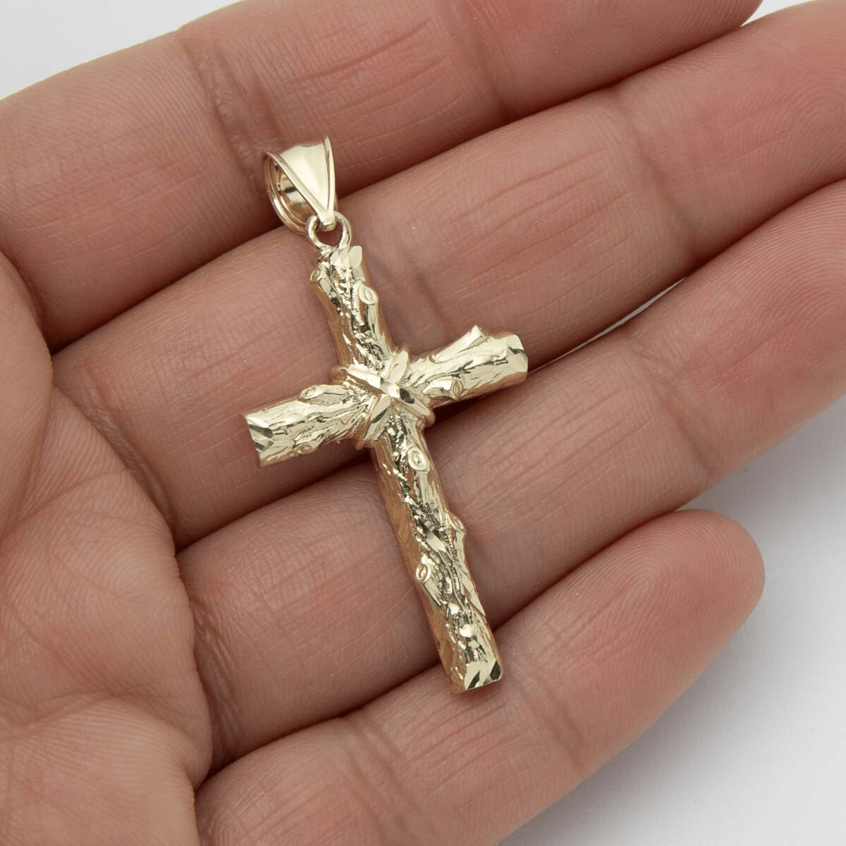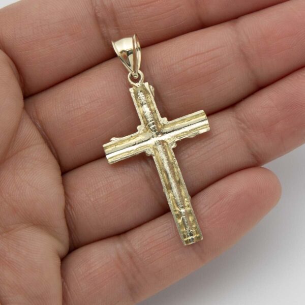 With a substantial 1 3/4 inch (46mm) length and 7/8 inch (23mm) width, this cross pendant provides a noticeable presence without being overly heavy. The durable bail measures 6.5mm x 4.5mm, making it compatible with a wide range of chains. Weighing approximately 2.87 grams, this 10k gold pendant balances quality craftsmanship with comfortable wear.