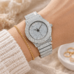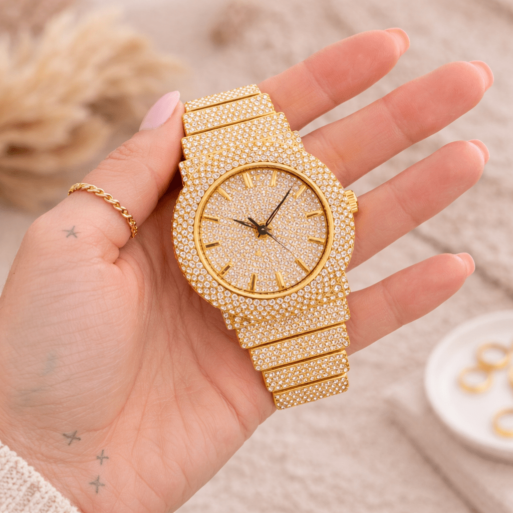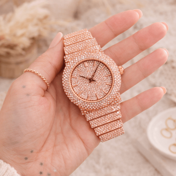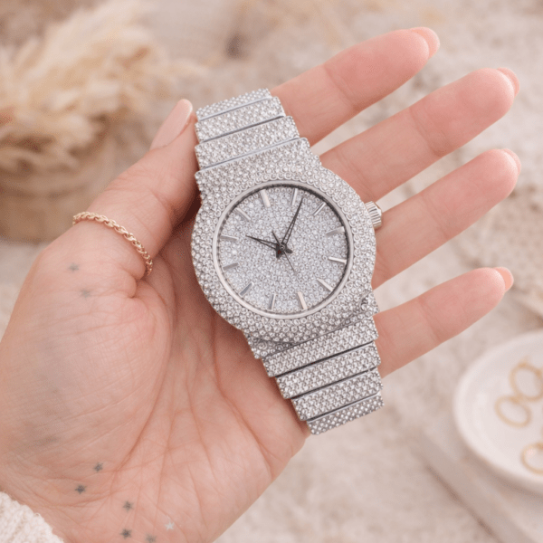 This luxury watch is designed for women who want to stand out. The fully iced design reflects light beautifully, giving you that high-end, designer look without the high-end price.